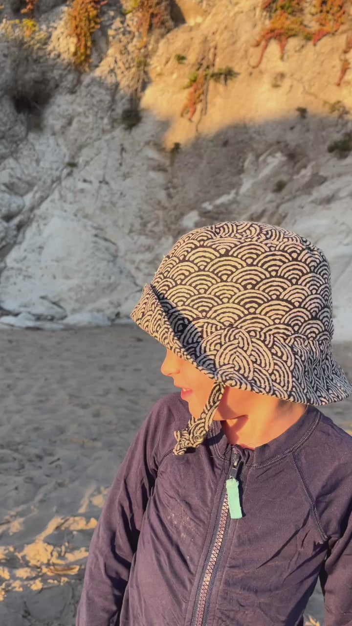 I made this sun hat from a blue with white waves design on cotton fabric for a playful accessoroy. The strap closes with snaps under the chin keeps them from pulling it off. Brim measures approx. 2.25 inches.