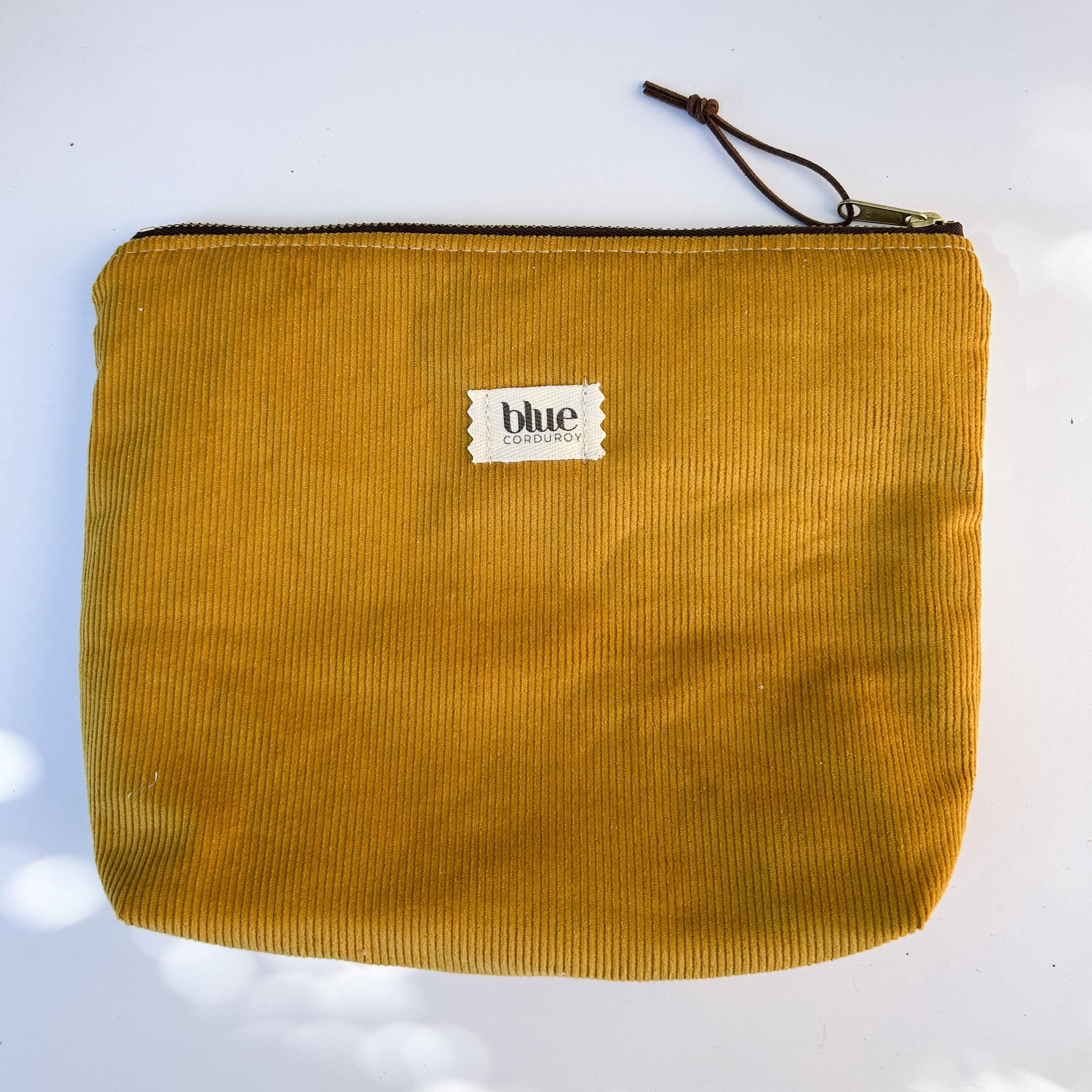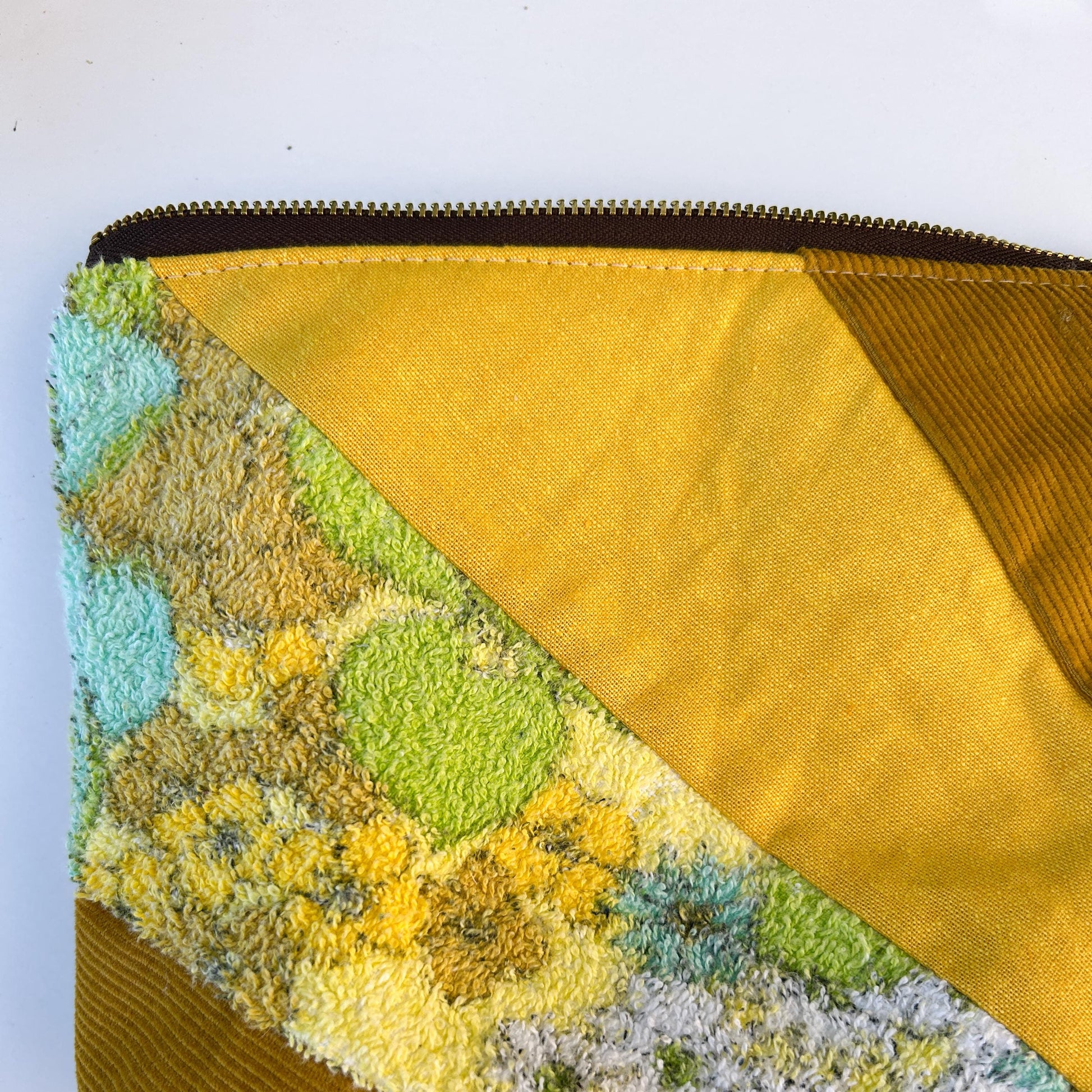 Yellow patchwork zipper pouch with corduroy, vintage towel, and linen fabrics. This bag meaures 10" x 8" and is the perfect size for holding your make up, toiletries, back to school items, and so much more!